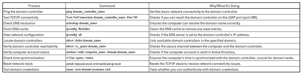 Test-NetConnection domain_controller_name -Port 389: Checks TCP/IP connectivity on the LDAP port.