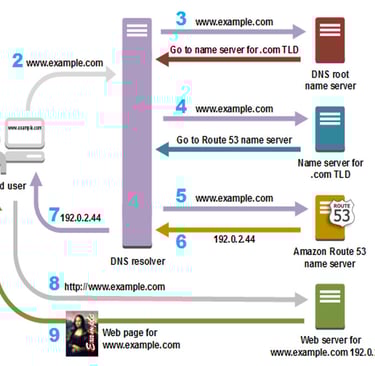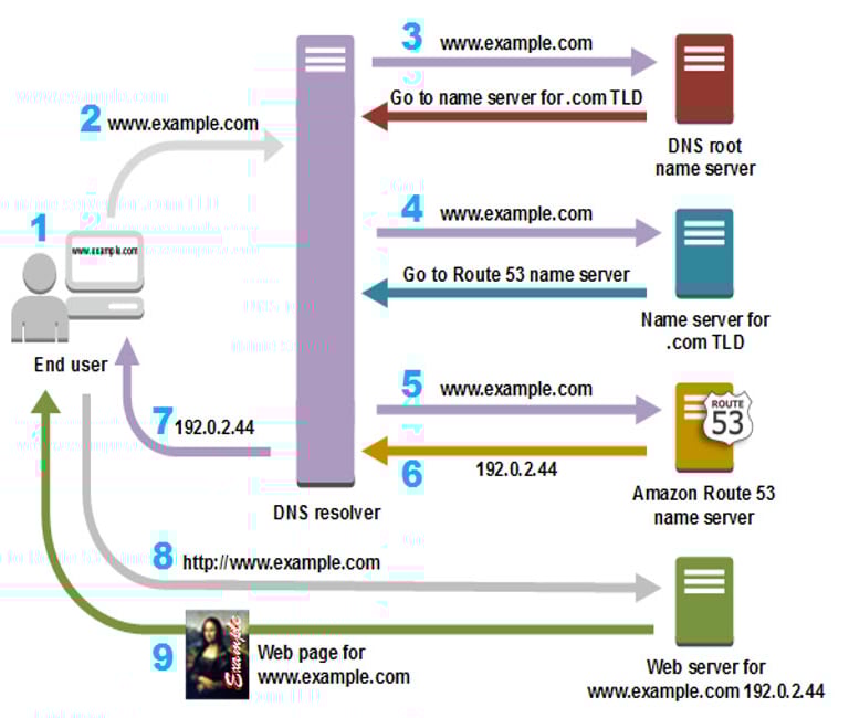 to example.com. For more information, see time to live (TTL).The web browser sends a request for www.example.com to the IP address that it got from the DNS resolver. This is where your content is, for example, a web server running on an Amazon EC2 instance or an Amazon S3 bucket that's configured as a website endpoint.