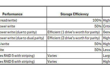 How it works: RAID 5 stripes data across three or more drives and includes parity data for redundancy. The parity data is used to rebuild data in case of a drive failure.